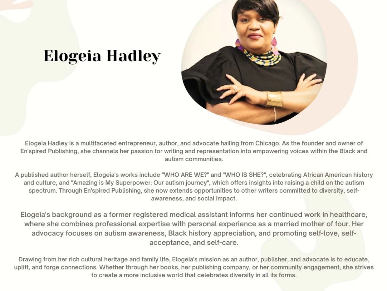 Elogeia Hadley is an author, publisher, teacher, and autism advocate who loves to tell stories about history and share her knowledge and support regarding autism. She enjoys incorporating Black history facts into her storytelling. Elogeia is also dedicated to helping others share their stories with her Publishing company En'Spired Publishing LLC.